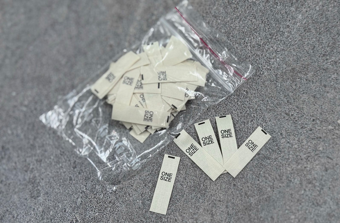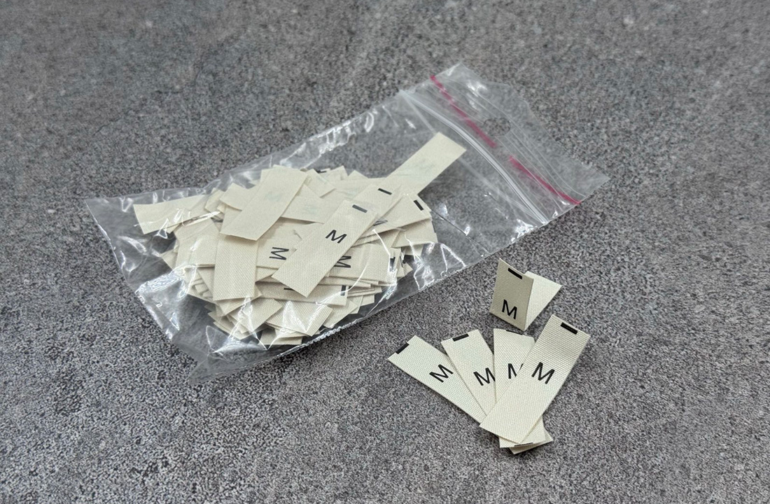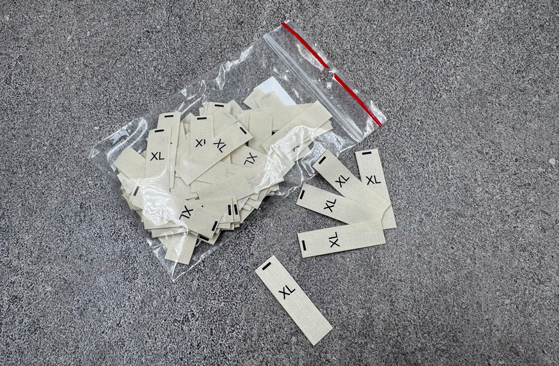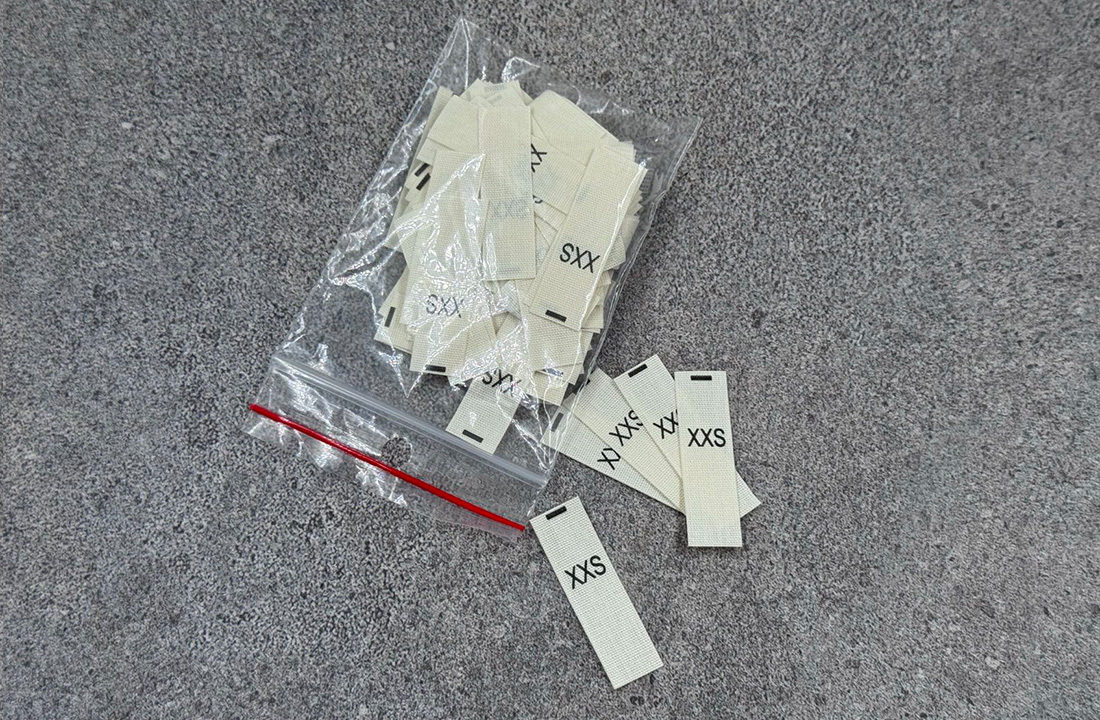 Gelsvos medvilnės XXS, XS, S, M, L, XL, XXL, One size dydžių etiketės, 10x35mm dydžio.