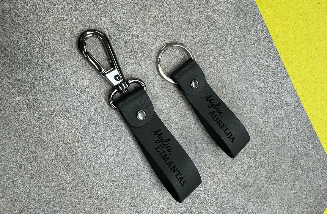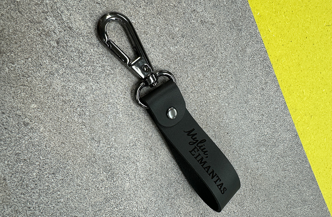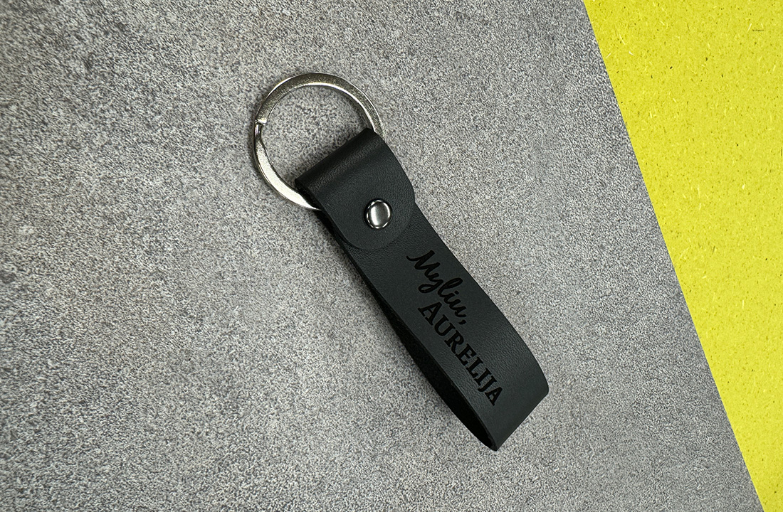 Raktų pakabukas, juodos spalvos natūrali oda ir jūsų norimas trumpas užrašas, kurį išgraviruosime lazeriu.
