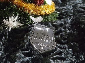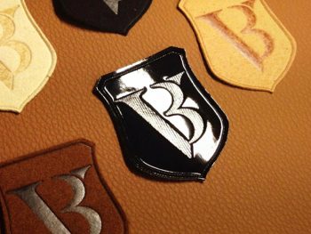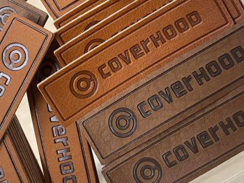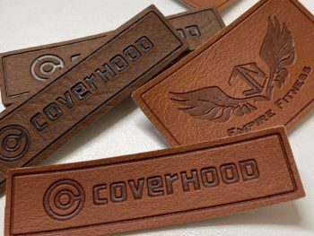 Dermantino (dirbtinės odos) etiketės su jūsų logotipu ir auksine/sidabrine spauda